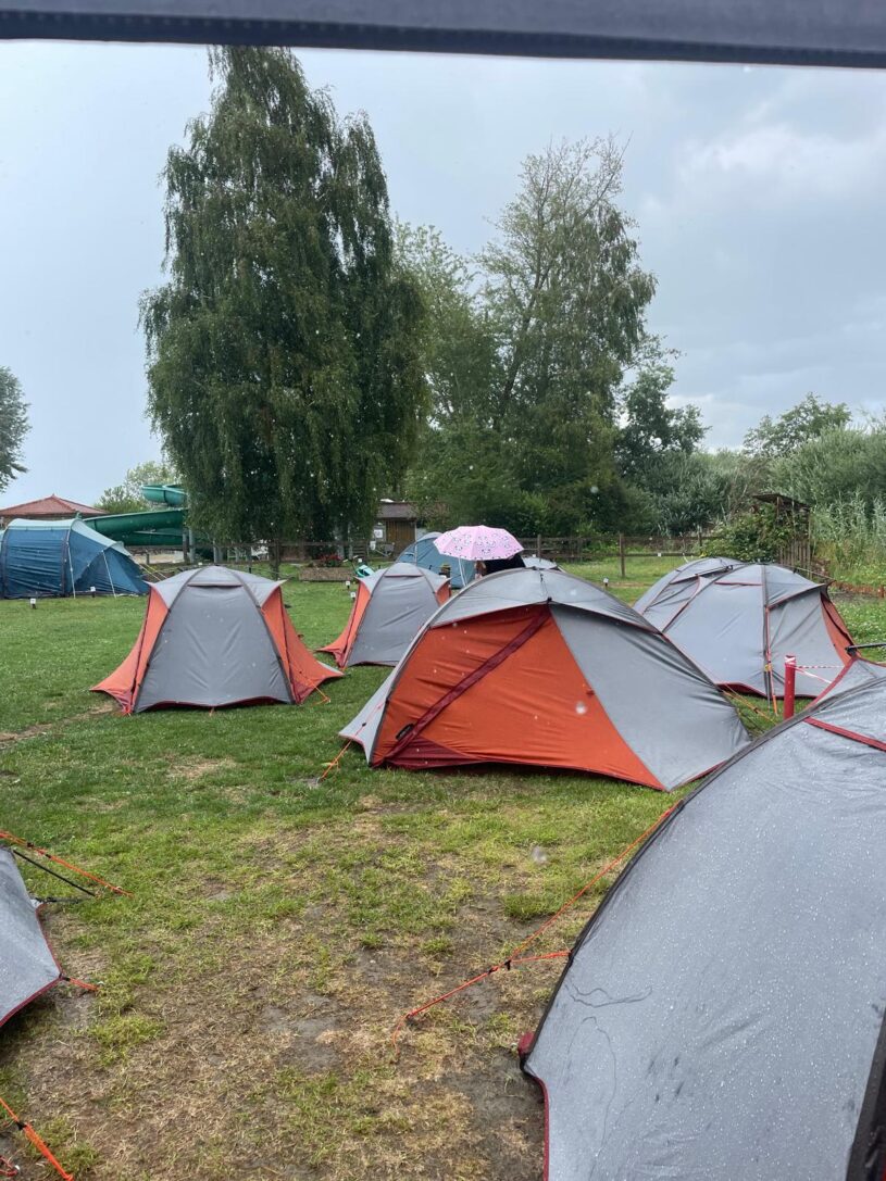 Bereits beim Aufbau der Zelte wurde uns klar: Das wird spannend. Der Wind pfiff uns um die Ohren, der Regen liess nicht lange auf sich warten und die Zelte – nennen wir sie „kuschelig kompakt“. Während wir versuchten, diese kleinen Stoffburgen irgendwie wetterfest zu errichten, blieb der Humor nicht auf der Strecke. Mit vereinten Kräften und einer ordentlichen Portion Improvisationstalent stand schlussendlich unser Lager – bereit für die kommenden Tage.